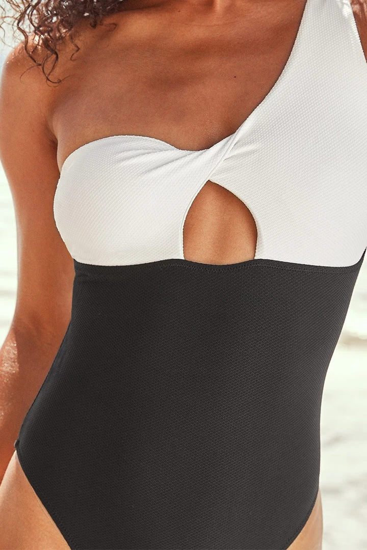 Enjoy the warm breeze in our Belle One Shoulder One Piece Swimsuit. Featuring a one shoulder silhouette and a twist front with cut out detailing. Designed to fit and flatter your curves.