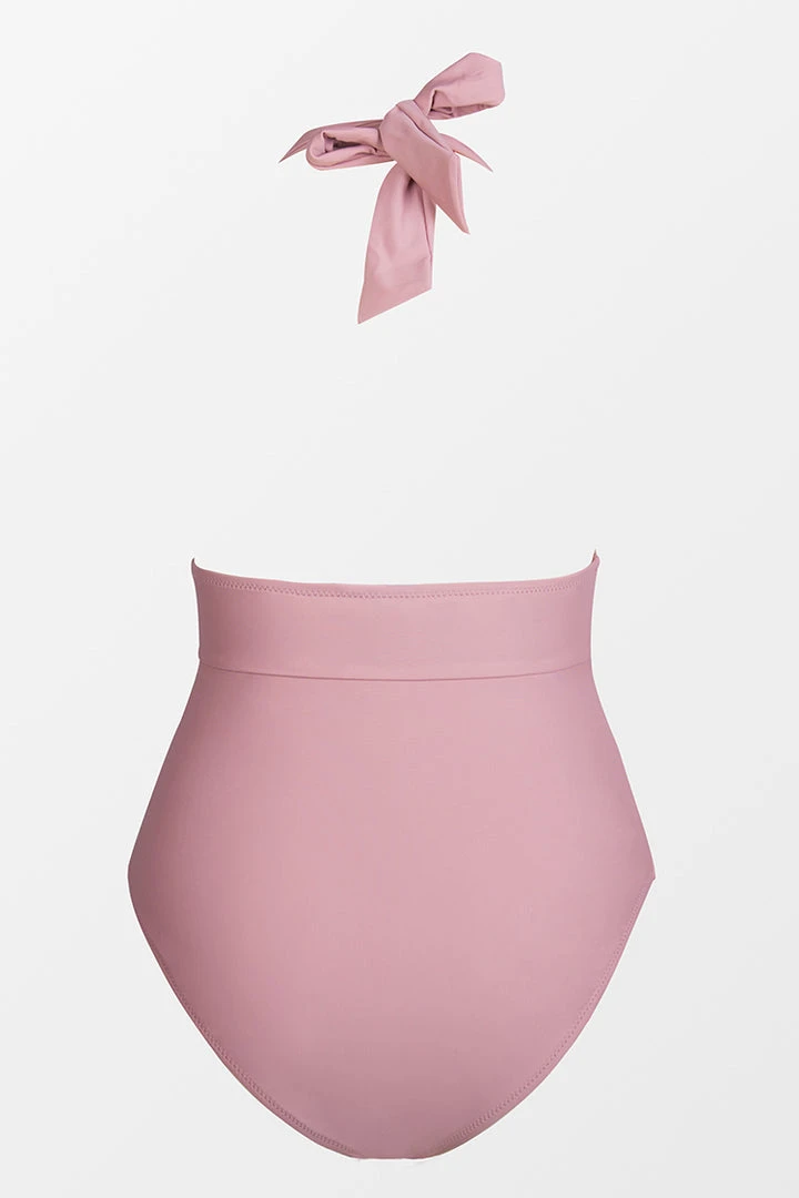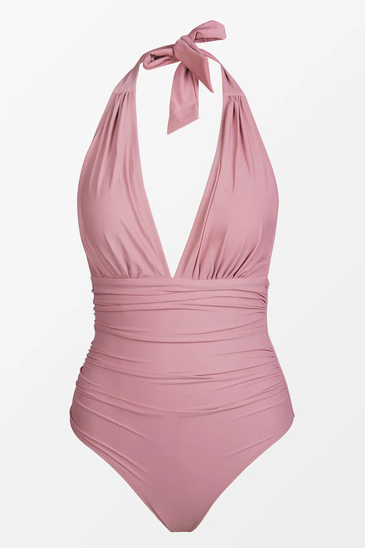 Our Bianca Dusty Pink Plunge Halter One Piece Swimsuit looks great on every body! This bathing suit features a deep v-neck, ruching at the bust and padded cups for added support.