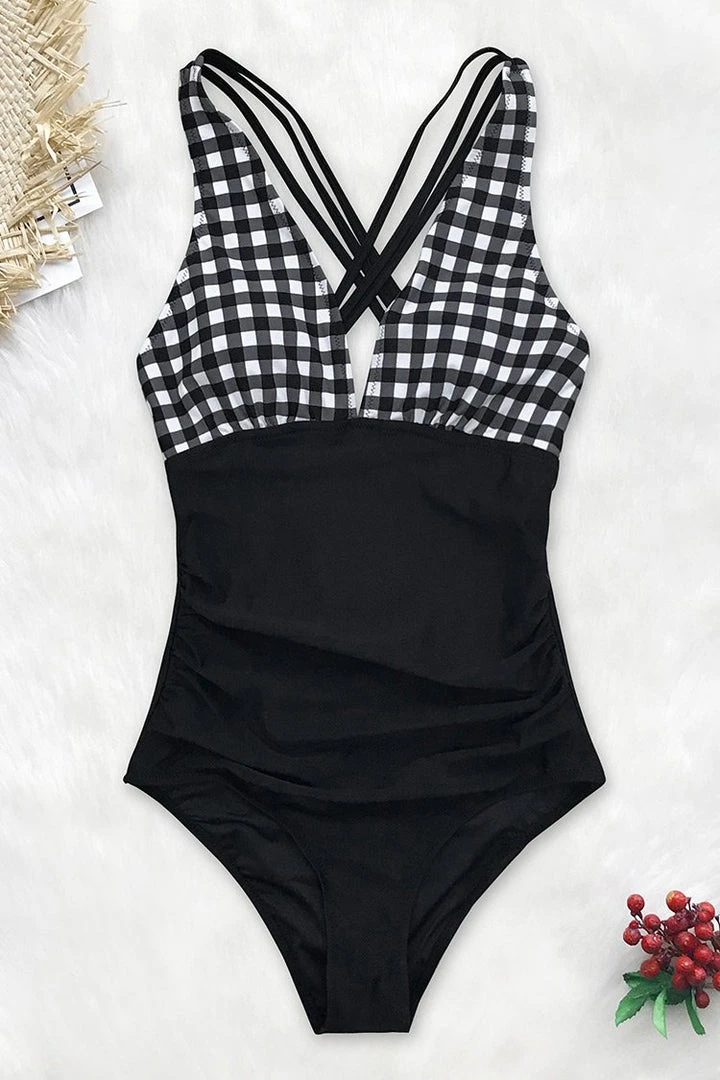 Gingham is the must-have print of the season! Our Black and White Gingham Ruched One-Piece Swimsuit features back cross straps and black color block. Ruching at the front for a slimming silhouette.