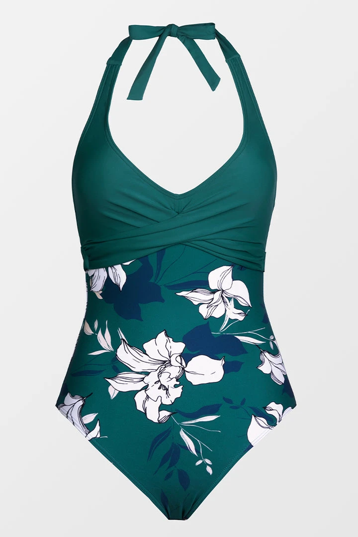 Bring beautiful florals to your poolside look with Charmed Romance Crossover One Piece Swimsuit. The pretty one-piece features a halter neckline, chic wrap at the bust, and classic coverage.