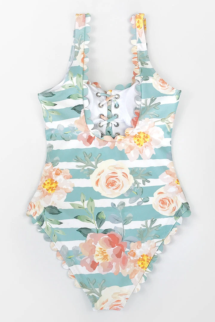 This sweet floral lay-in-the-sun bathing suit is the one we love. Our Floral and Striped Scalloped One-Piece Swimsuit features scalloped trim, lace up front and removable padded cups for light support.