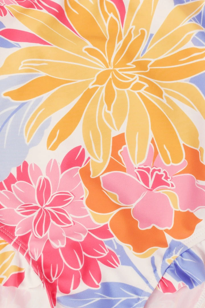 A sweet print and ruffled trims add ultra-sweet charm to this one piece swimsuit for girls.