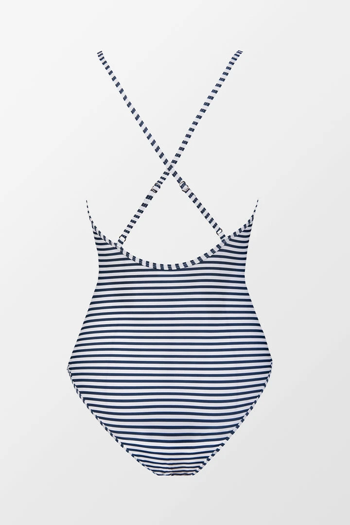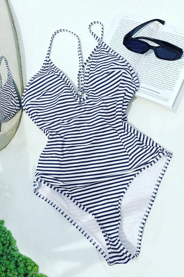 A modern take on black and white stripes. The Lasting Appeal Stripe One-Piece Swimsuit has shoulder straps that crisscross at the back.