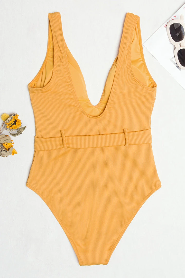 Slay the whole beach in our Lizbeth Rib O-ring Belted One Piece Swimsuit. Features o-ring front, plunging neckline with a belt. Perfect for a day of lounging by the pool or soaking up the sun.