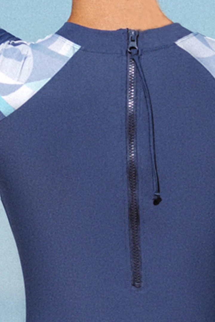 The long sleeve swimsuit blends a retro, geometric print on the sleeves with a solid color bodice to create a standout style. With enhanced sun protection and a secured zip back closure, this swimsuit will keep the fun in the sun going longer.