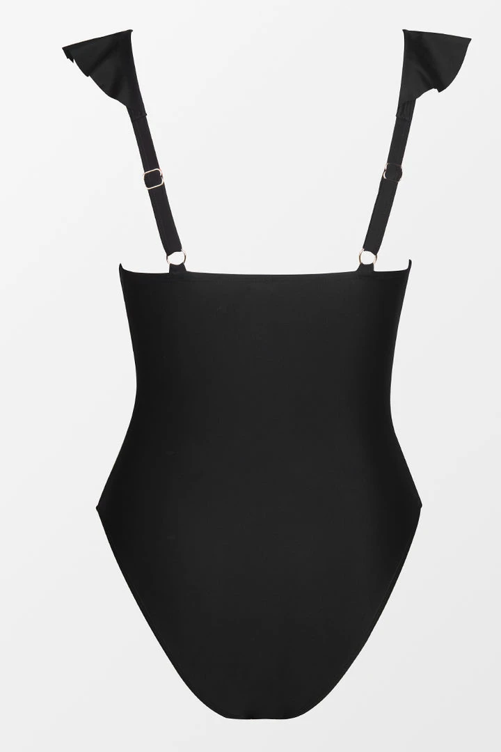 With its delicate ruffles, sash belt, and plunging neckline, this one piece highlights your femininity and makes a stylish match with a minimalist cover up.