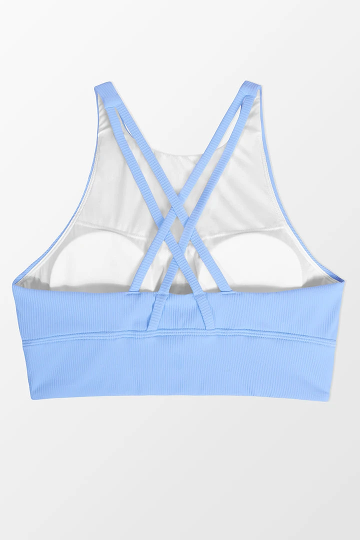 Loving our Paradise Point Blue Criss Cross Sports Bra. Features with small round neckline on the front and double crisscross thin straps on the back. Supportive bottom hem.