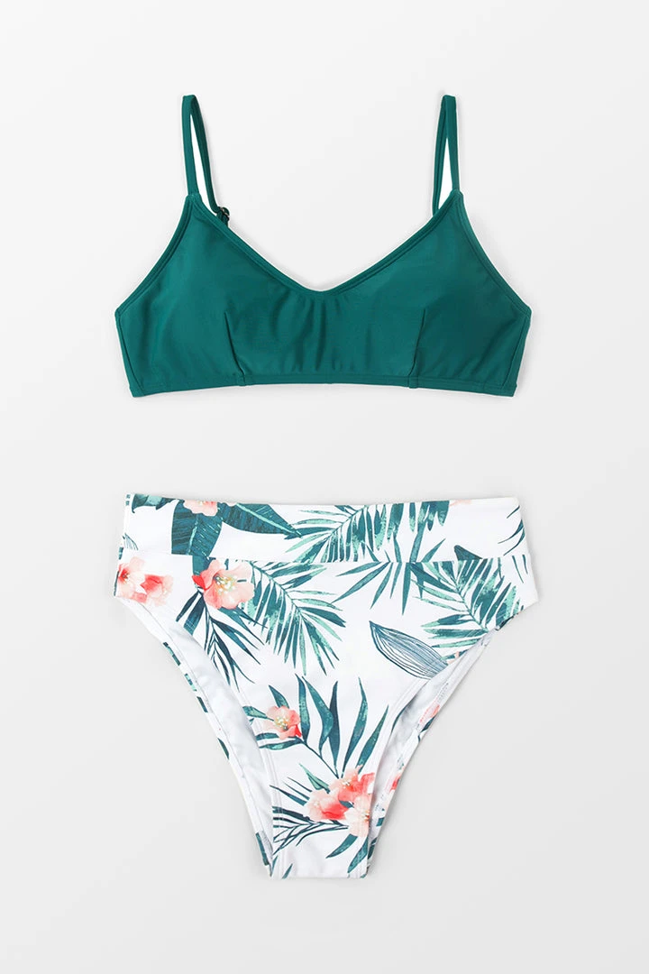 Part of the Paluma Falls Collection, the two-piece swimsuit comes with a sleek mini bralette and a flattering high waist bikini bottom. A tropical leaf pattern adds lush vibes to the look.