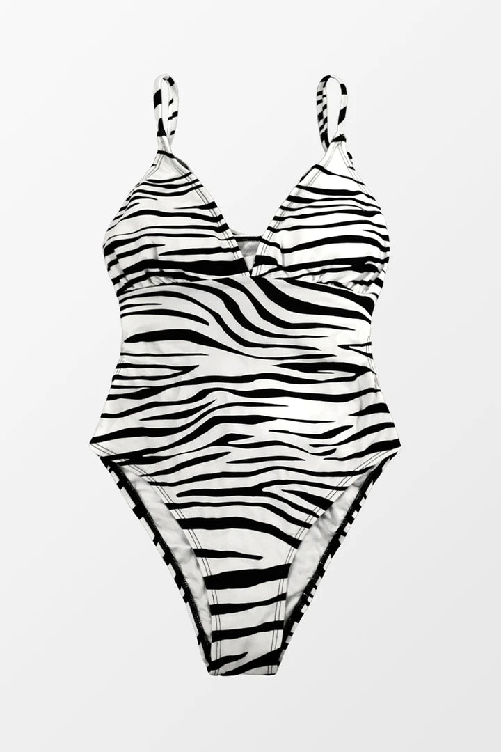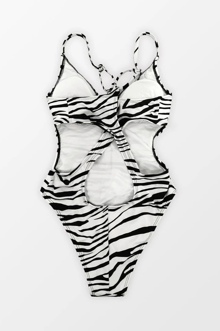 Inject some animal print into your summer wardrobe! This one-piece swimsuit features an allover zebra print, plunging V-neckline, strappy crisscross back forming cutouts, and cheeky bum coverage. Â