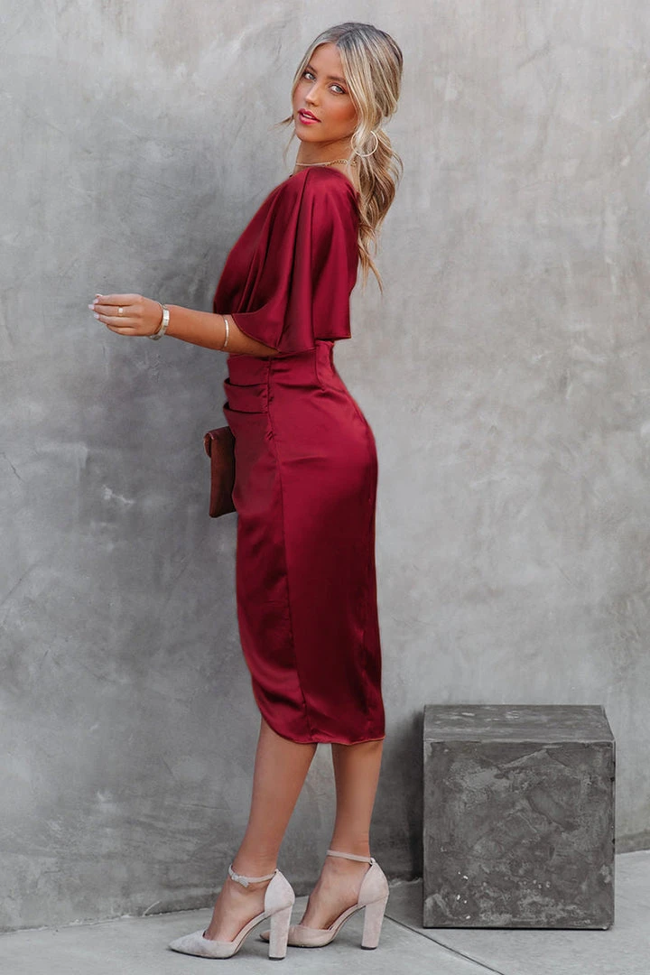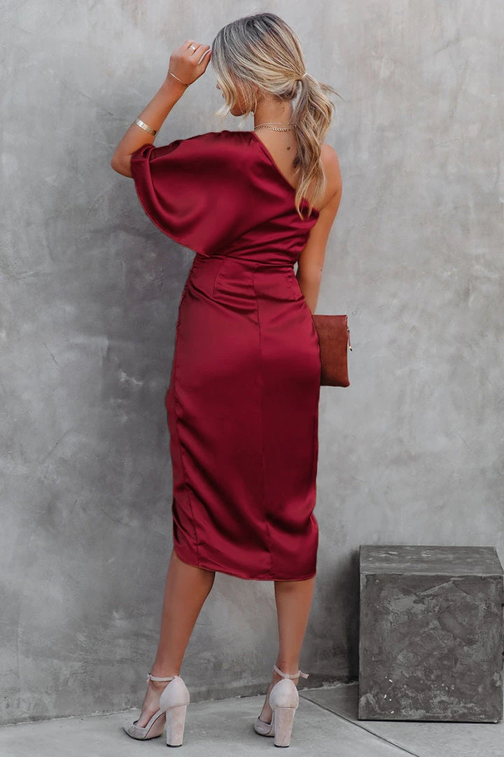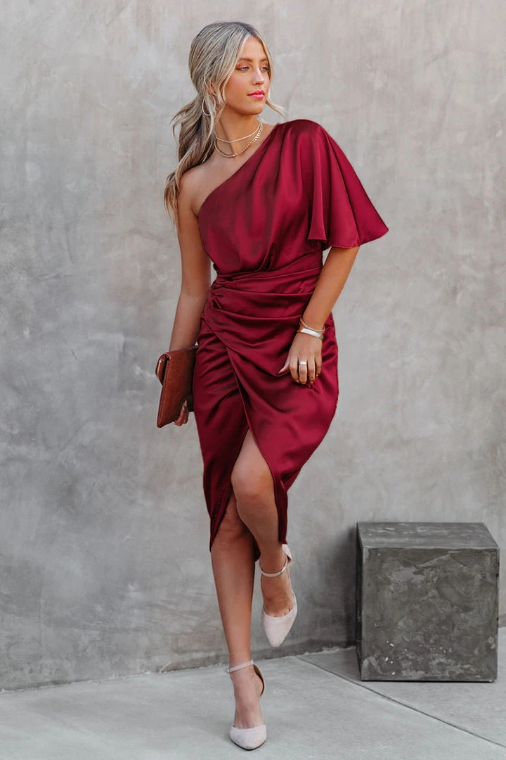 Add this dress to your summer wardrobe. This Ramla Burgundy Sheath One-shoulder Dress features pretty irregular hem. Tea length with ruching detail. The elastic waist brings it all together.