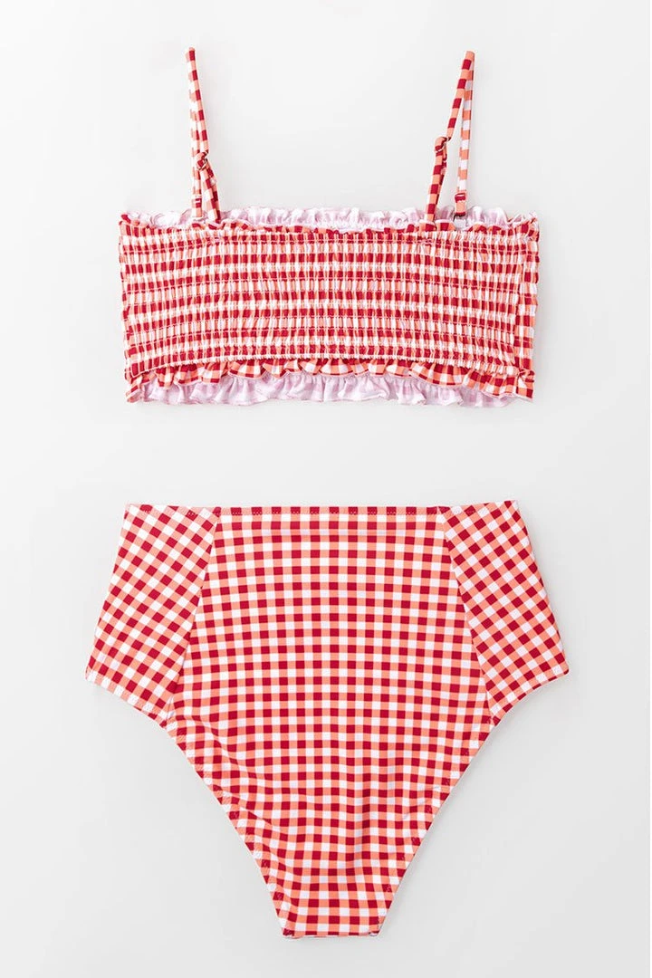 Timeless and sweet, the Red Gingham Smocked Bikini is perfect for your next beach or picnic outing. You’ll love the unique style of a bandeau bikini top with the smocked material for a pretty look with sweet texture. The gingham bikini bottom has a high waist for a vintage flair.