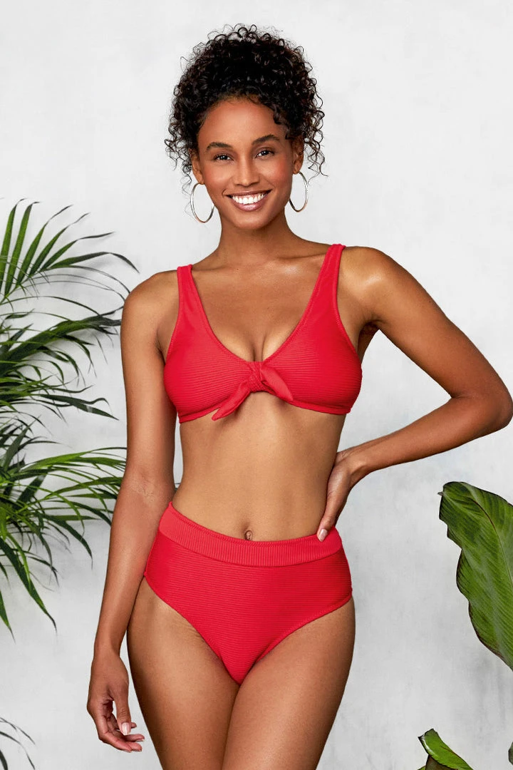 Hit the beach in our Ribbed Red Bowknot Bikini set. The bikini top has a front bowknot detail with removable padded cups. The bottom features moderate coverage with a mid rise silhouette.