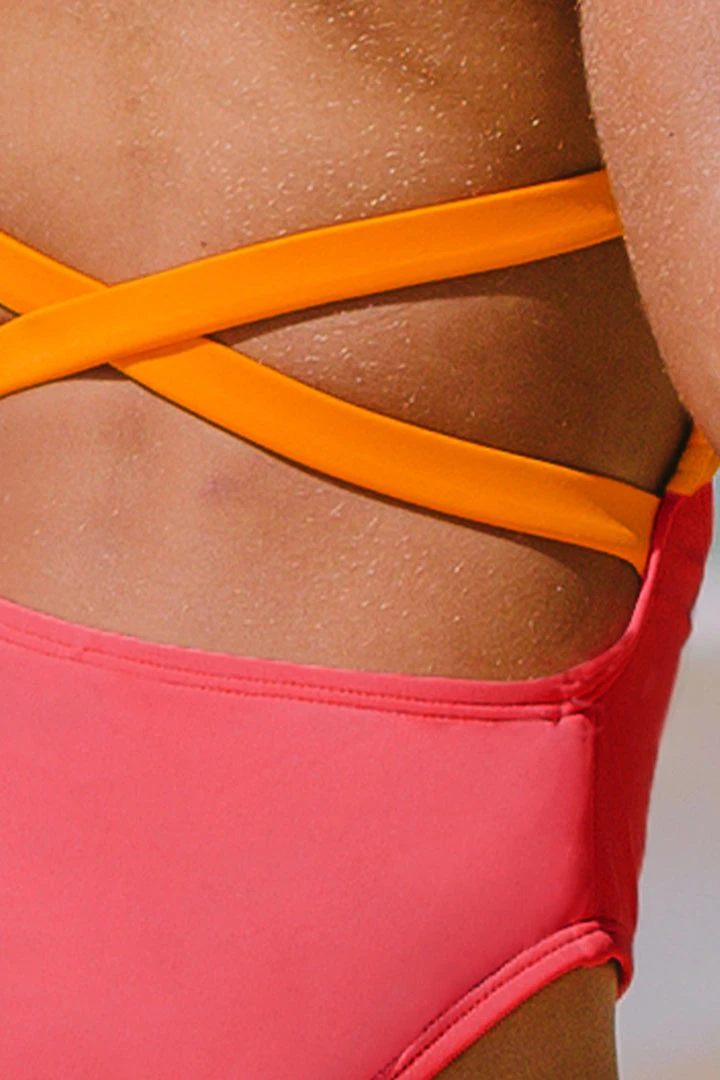 Your little girl can splash around in style with this one piece swimsuit, featuring a colorblock design and cross back straps. The center cutout adds a cool accent to her beachside outfit.