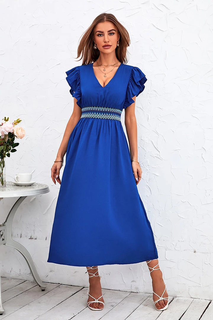 This Set in Sleeve Smocking Dress is perfect for taking on the new season. Featuring a smocking design, V neckline, ruffle sleeves, and an elastic waist. The ruffled detailing adds an extra sweet touch.