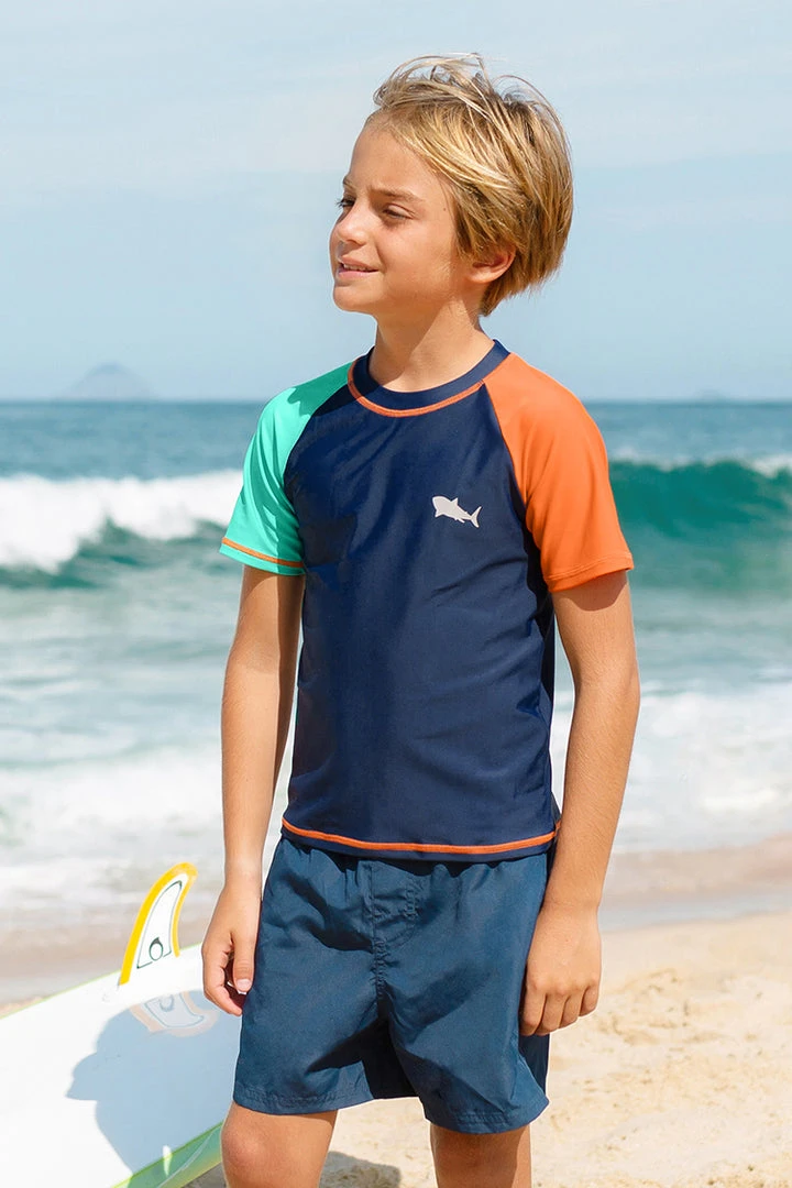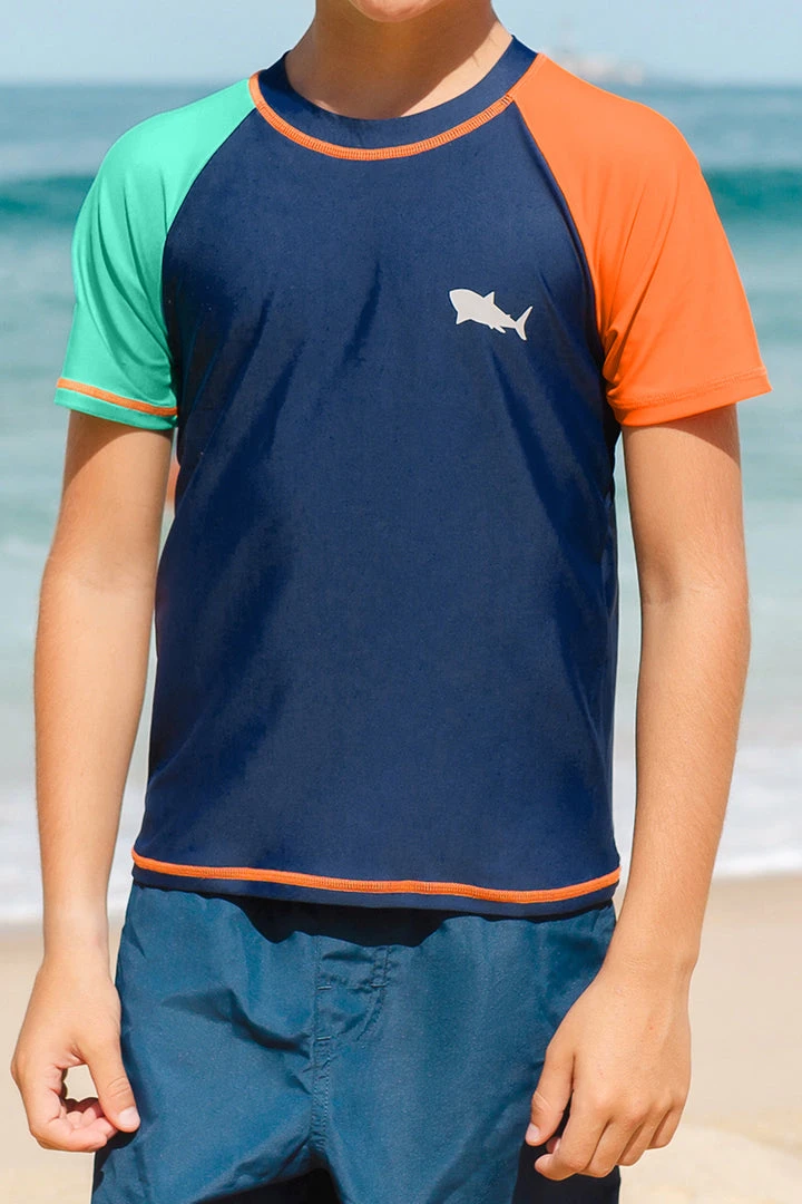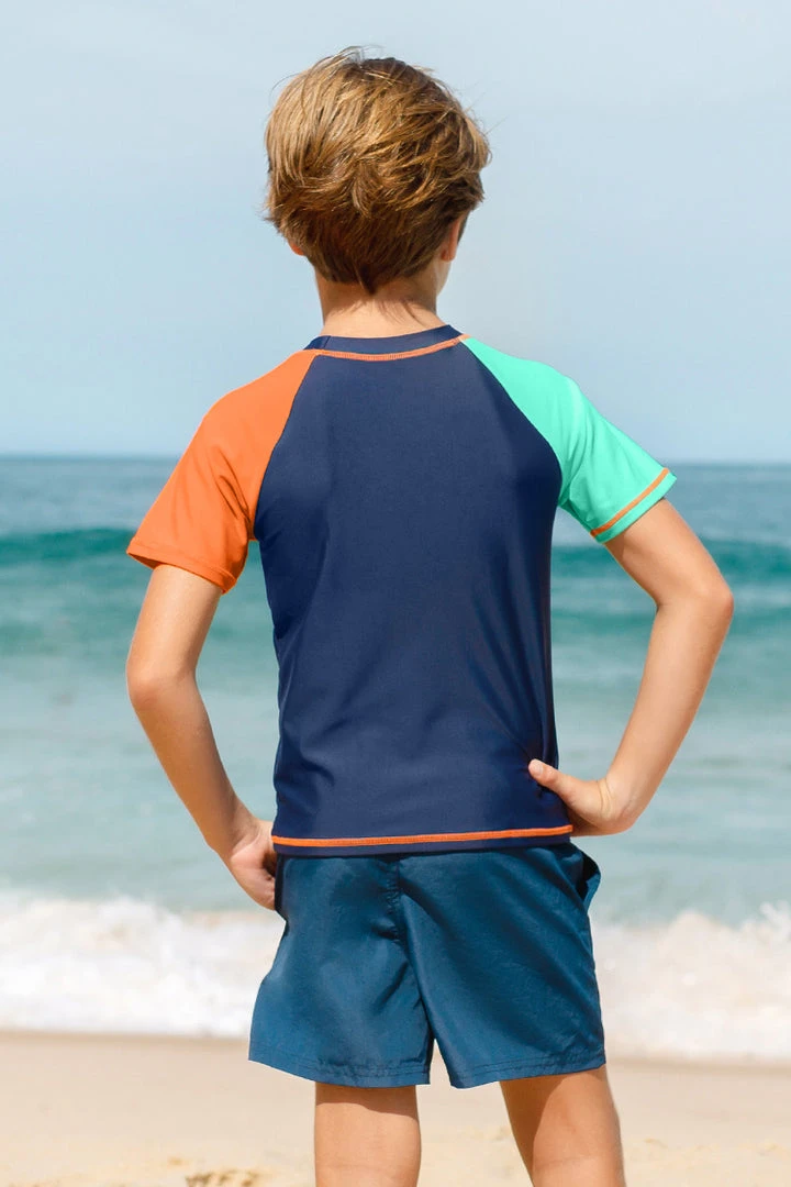 Introduce him to the cool club with this colorblock swim tee. A pop of color stitching and contrasting colors means he will never get lost in a crowd.