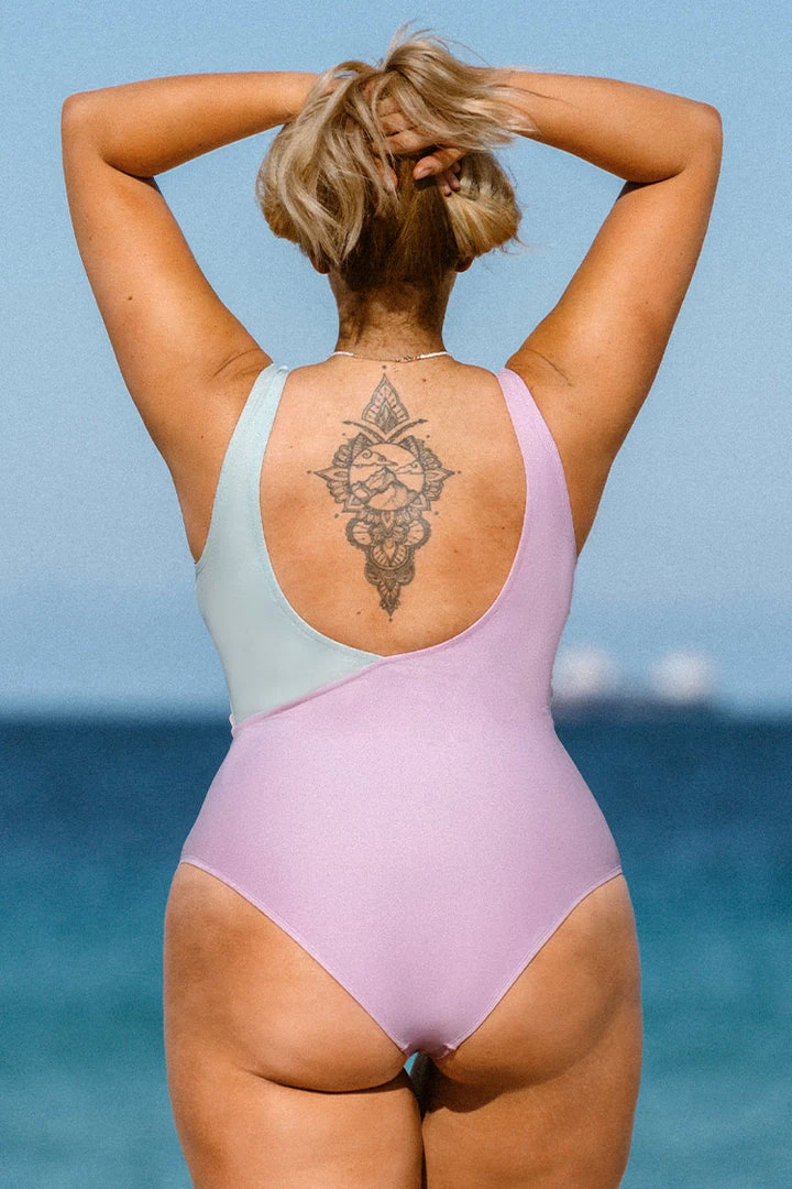 A flattering twist front at the bust puts a modern spin on this simple one piece. Scalloped trims along the neckline give the piece a romantic appeal.