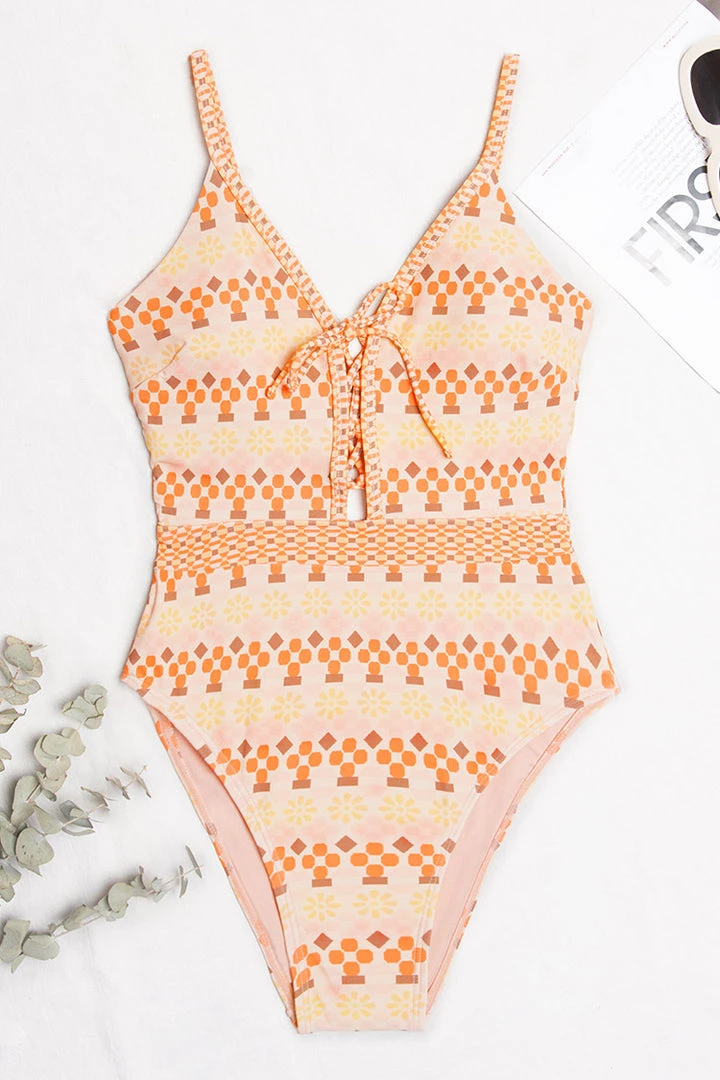 Stefanie Geo Print Lace-up One Piece Swimsuit is cute and flirty. Features geo print and lace-up front. Cut-out back detailing add more sexy vibe.