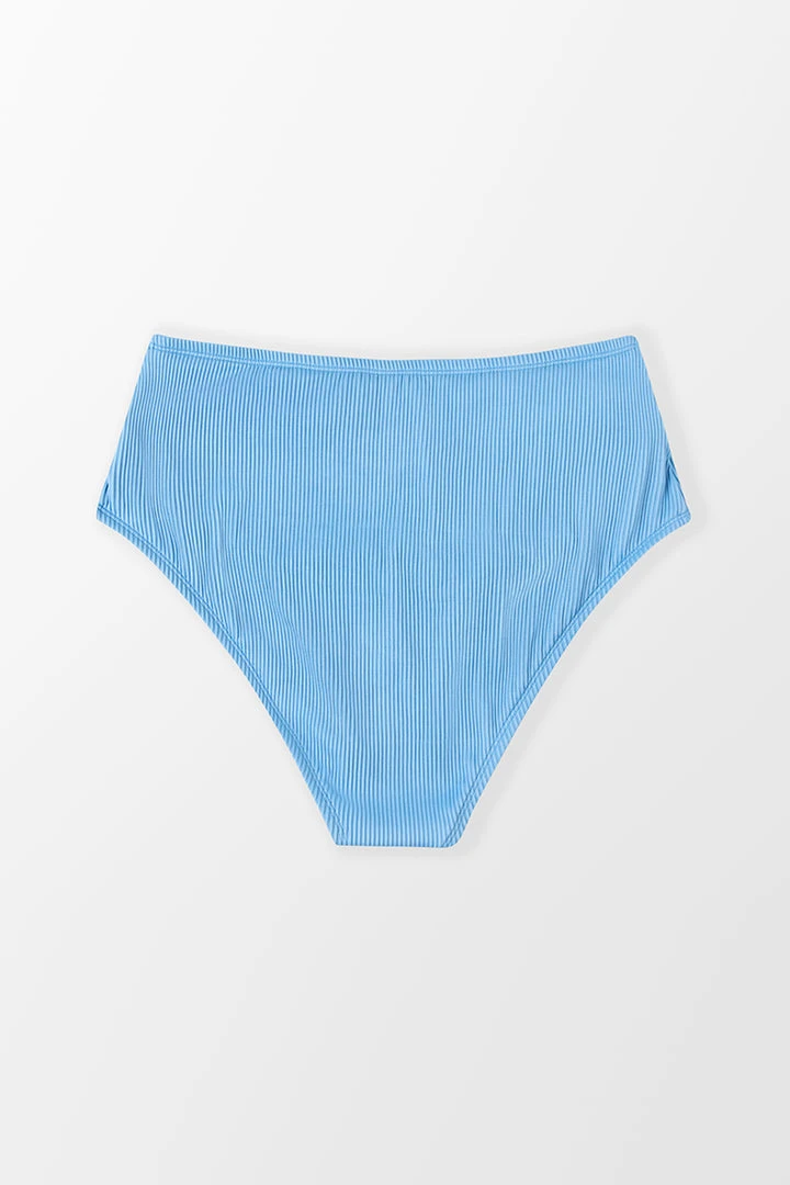 PSA: high waist bikini bottom is here to stay. This blue bikini bottom with an elegant front tie has a flattering silhouette and offers comfortable wear in soft ribbed fabric.