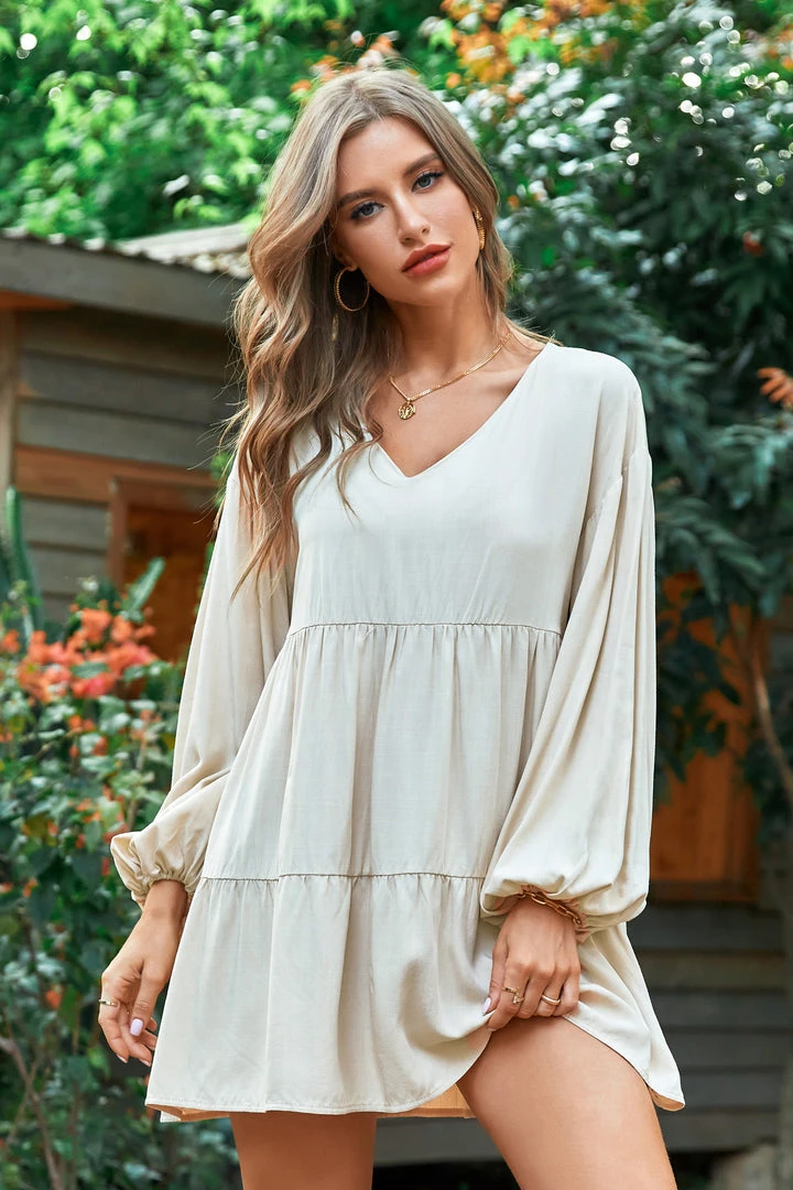 Our Cofete Apricot V-neck A-Shape Dress features special puff sleeves. Put on our cute and comfortable dresses together!
