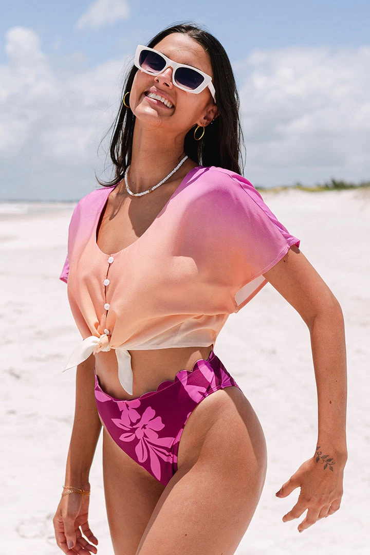 You can never go wrong with our Summerslate Tie Waist Ombre Crop Cover Up Top. Eye-catching ombre print with dolman sleeve and Irregular hem elevates this style.