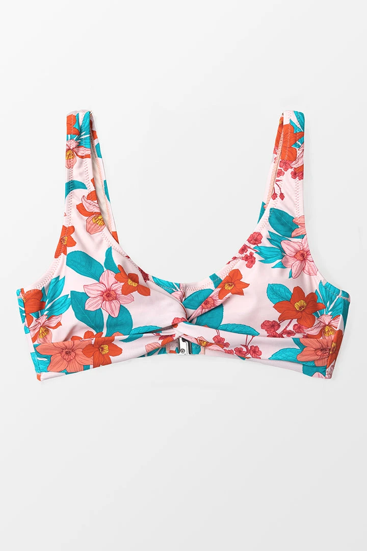 Rock the floral print trend in our Emerie Floral Twist Bikini Top, featuring a twist front and scoop neck. Complete the look with our Emerie Pink Bikini Bottom.