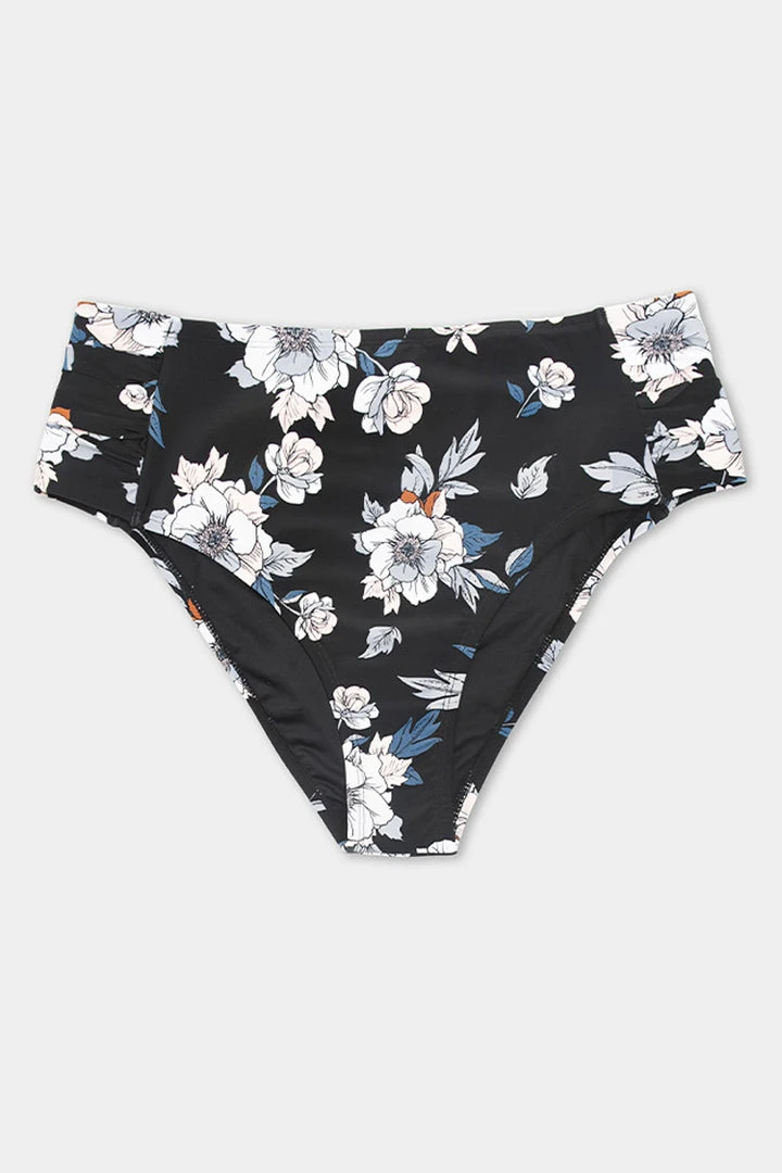 The floral print plus size bikini bottom features shirred panels at the hips for a charming look.