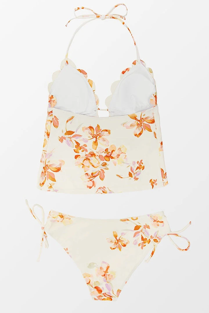 Feel super cute in our Adeline Floral Plunge Halter Scalloped Low Waisted Tankini. Features with plunge halter neckline with scalloped on the edges. Backless design and thin strap for decoration add a touch of sexy. The bottom have drawstring straps on both sides.