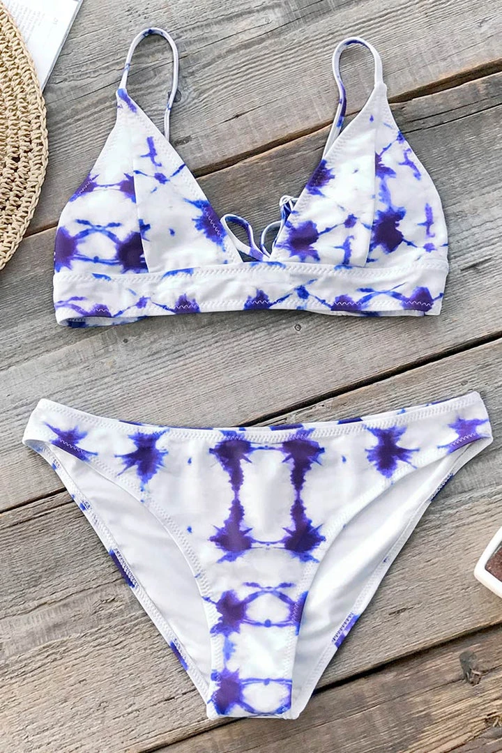 Tie dye season is in and we have you covered! This blue and white tie-dye swimsuit features lace-up detail at back. Wear this bikini poolside with friends or plan your Coachella outfit.
