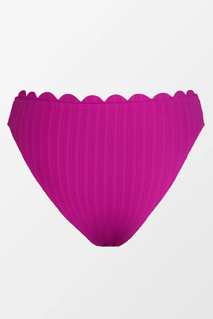 Cut from a stretchy and breathable ribbed fabric, the hipster bikini bottom features a sweet scalloped edge at the waist and a high waist and cheeky silhouette.