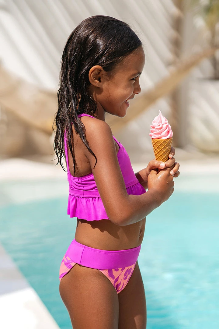 A beachside look that’s both stylish and comfy. The bandeau silhouette and ruffle trims add modern flair while the cutout at the back adds visual interest. The bikini bottom features a wide waistband and a colorful print.