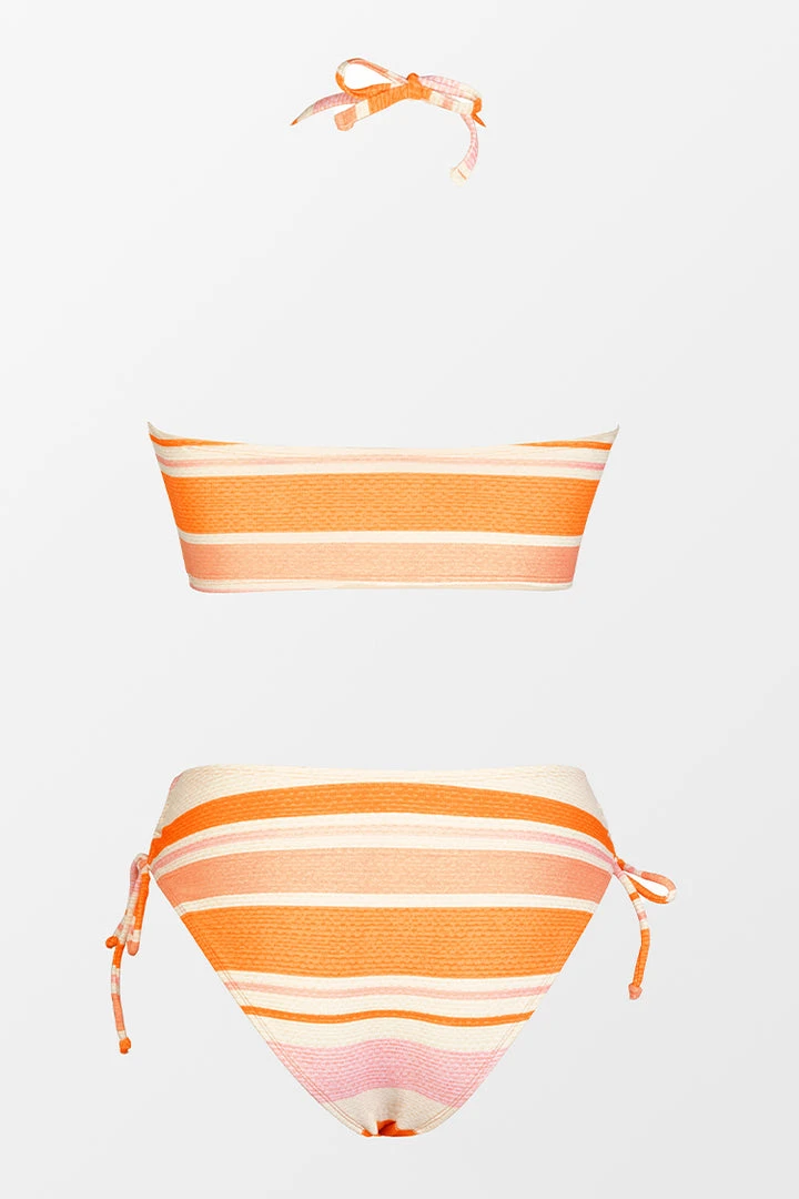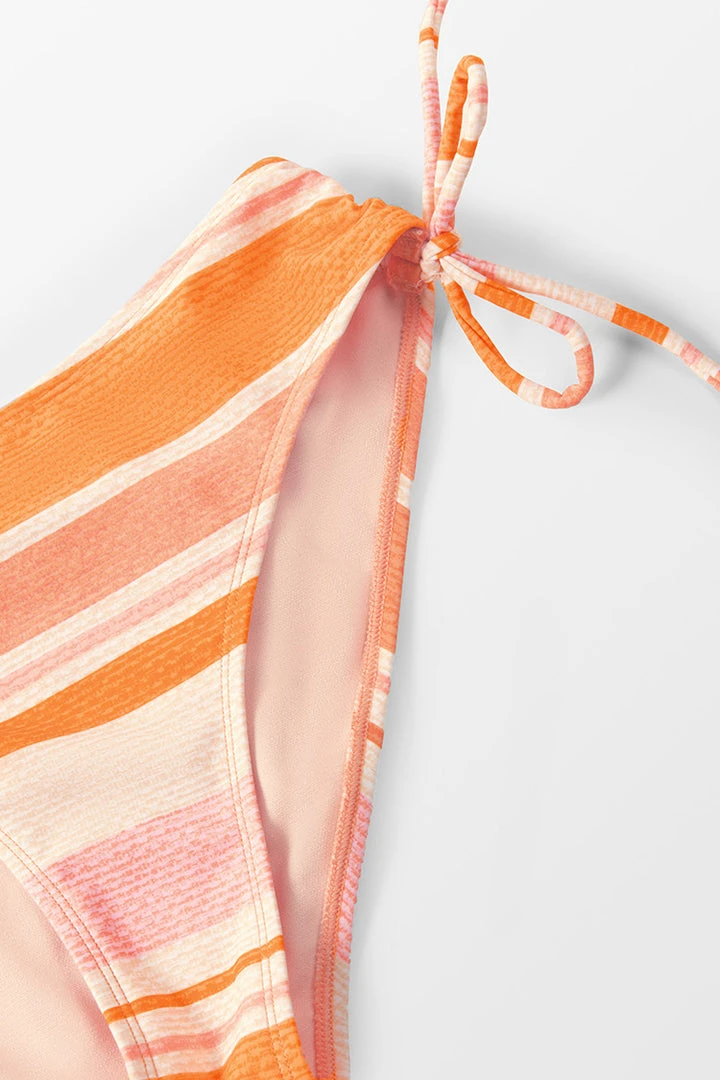 Perfect for chilling out and bronzing up, the bralette bikini top features a vibrant striped pattern and a tunneled neckline with sexy cutouts for a sleek look that complements your figure. The matching hipster bottom has adjustable side ties that let you customize your level of coverage.