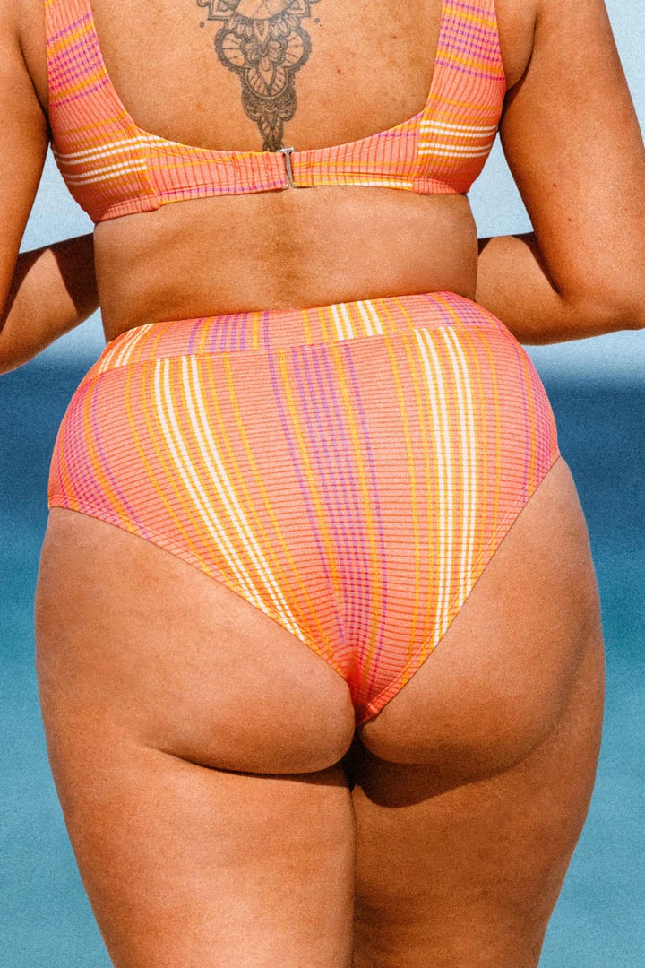 A sleek high waist bottom features a colorful striped pattern and offers standard leg and bum coverage.