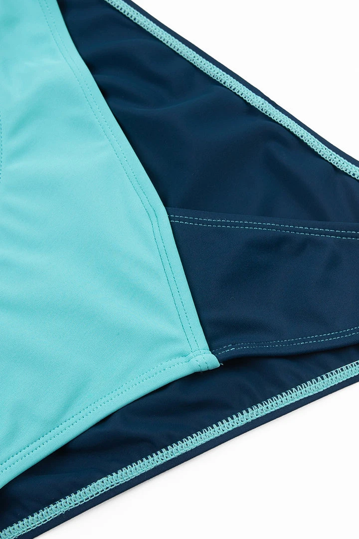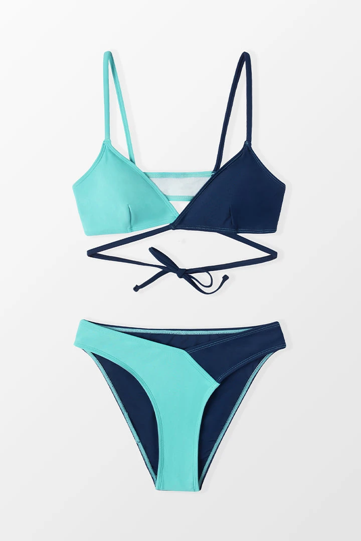Soothing color blocking shades amplify the sleek silhouette of this bikini set. The wrap bralette and V-hipster create a defined shape and accentuate your curves, giving you the confidence you deserve.