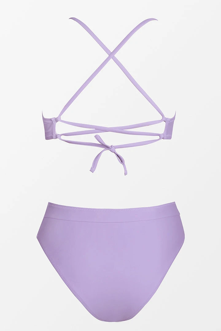 Turn heads in our Purple Lace Up High Waisted Bikini. The purple bikini top has lace up design at back, and ties at the front for a flattering look. The high-waisted bikini bottom stays put all day for some fun in the sun.