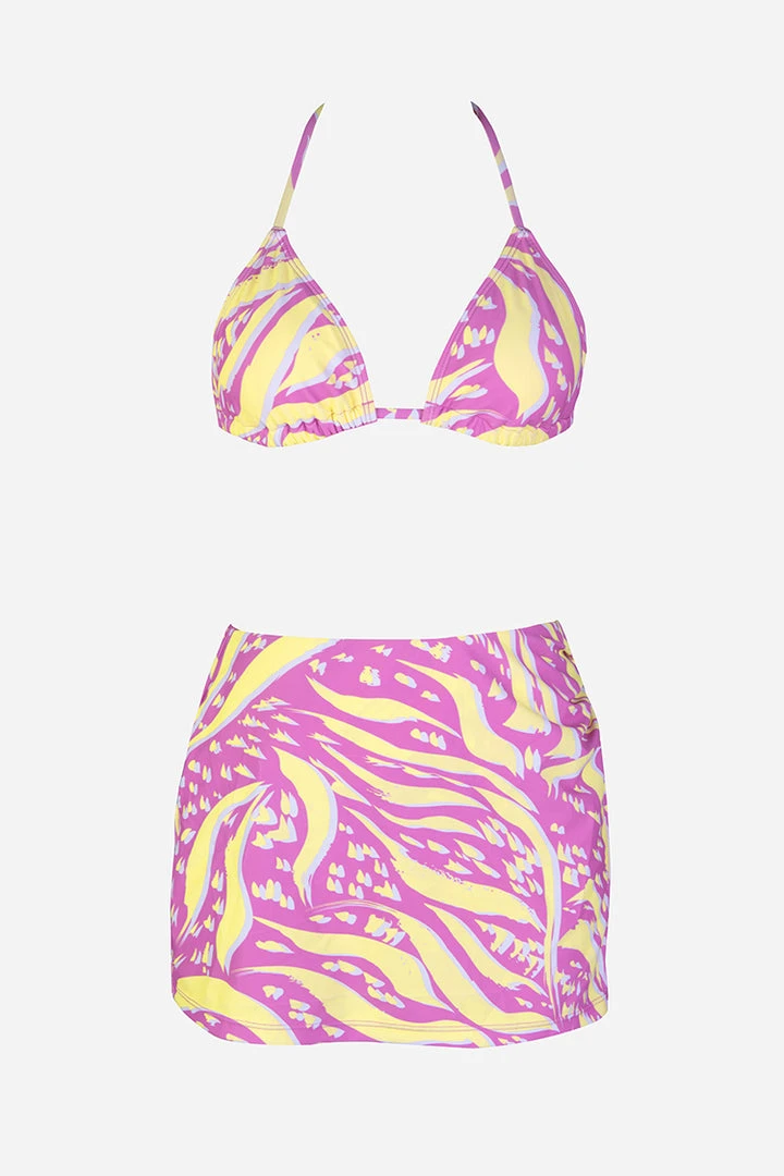 Turn up the flirt factor with this triangle top/swim skirt set in a colorful abstract print. The high waist swim skirt has split in front while giving you the coverage you need.