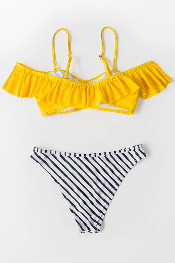 Infuse fun to your swimwear collection in our Yellow And Striped Ruffle Cold Shoulder Bikini. Detailed with a ruffle cold shoulder straps and a striped cheeky cut bottom. This set will have you feeling as fresh.
