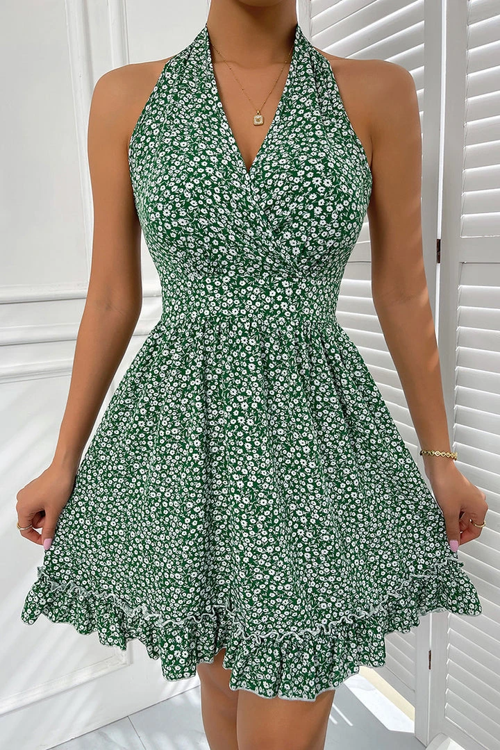 Make you comfy in our V-neck Sleeveless Halter Neck Off-shoulder Dress. This dress features floral print with sleeveless design. Frill detail and halter neck design serve up plenty of sweetness.