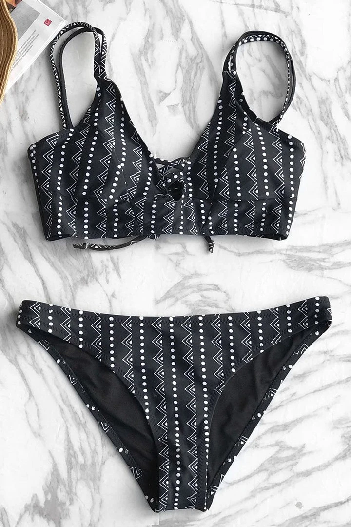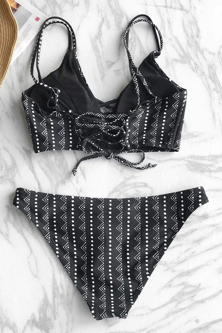 The black tone of the bikini is the definition of classic and retro. Featuring zigzag and dots pattern while adding versatility to this classic silhouette with criss cross straps at front and double straps at each shoulder.