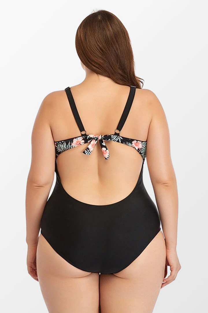 We are getting major vacation vibes from this one-piece swimsuit featuring a partial tropical floral and leaf print, plunging V-neckline, adjustable straps, mesh inserts, and ladder cutouts.Â