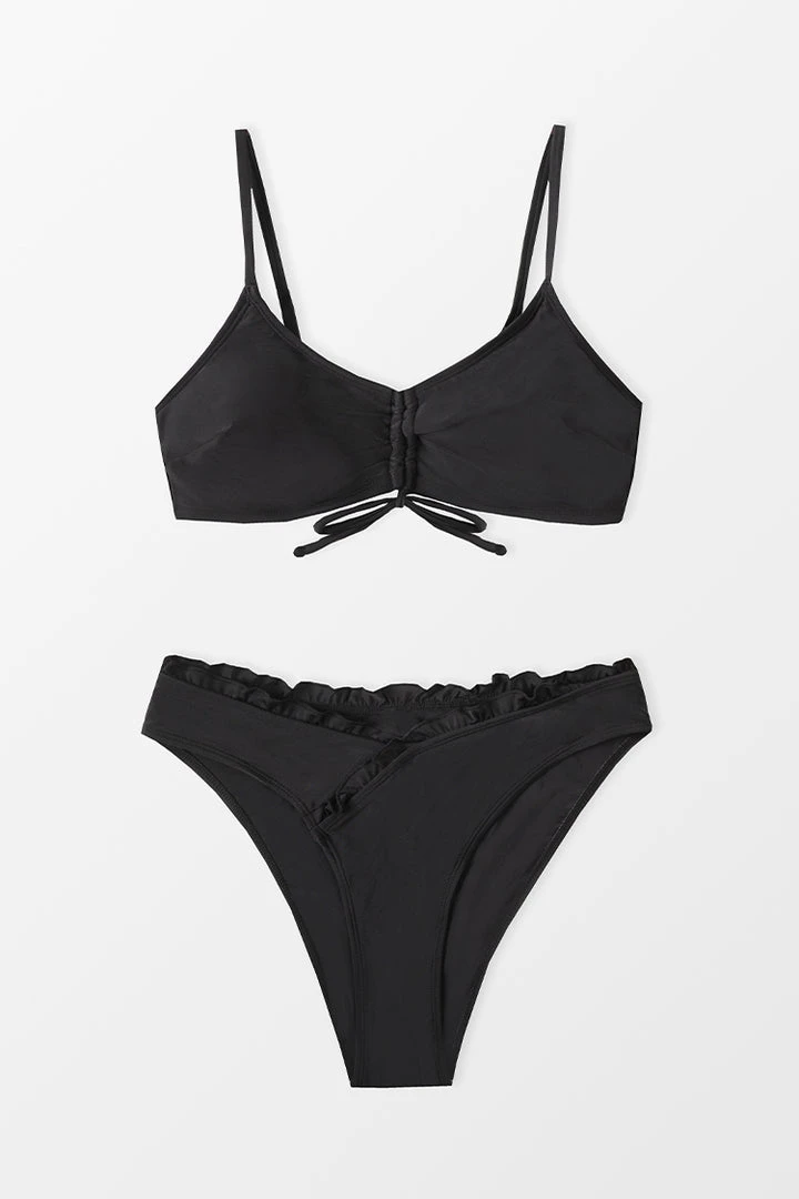 Sexy and sleek, this bikini set is everything you need for your next pool party! Featuring a bralette with a scoop neck, ruched drawstring front, and adjustable cami straps, as well as a matching pair of bottoms with a mid-rise waist and lettuce-edge trim .