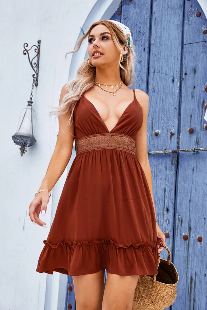 Never be without a perfectly romantic look with Vanda cutout Frill Short Slip Dress. Features with cutout and smocked fitted waist design.