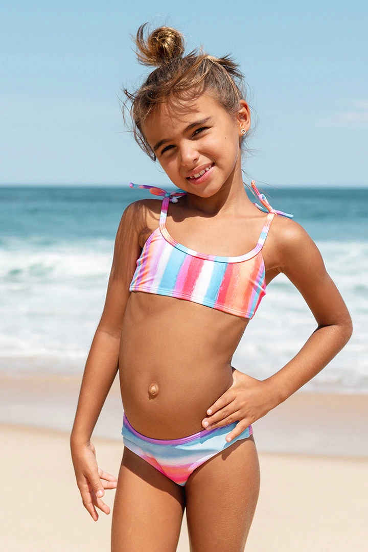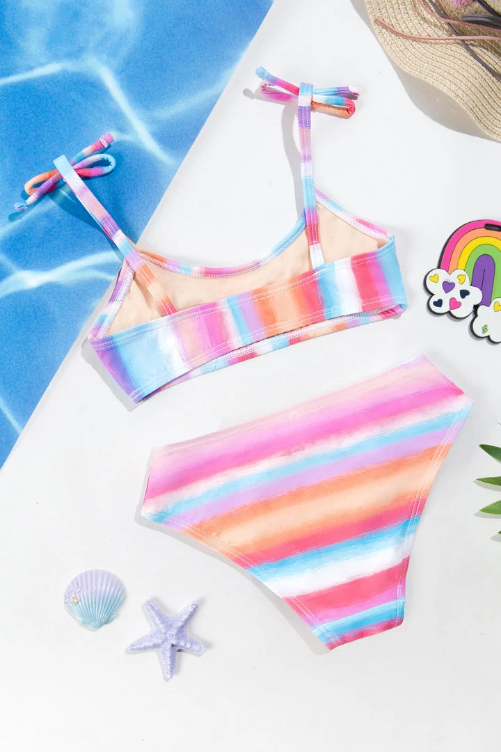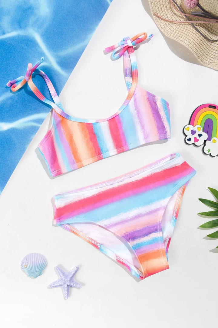 Features an allover rainbow striped pattern, scoop-cut neckline and self – tie cami straps. matching with a mid rise bikini bottom.