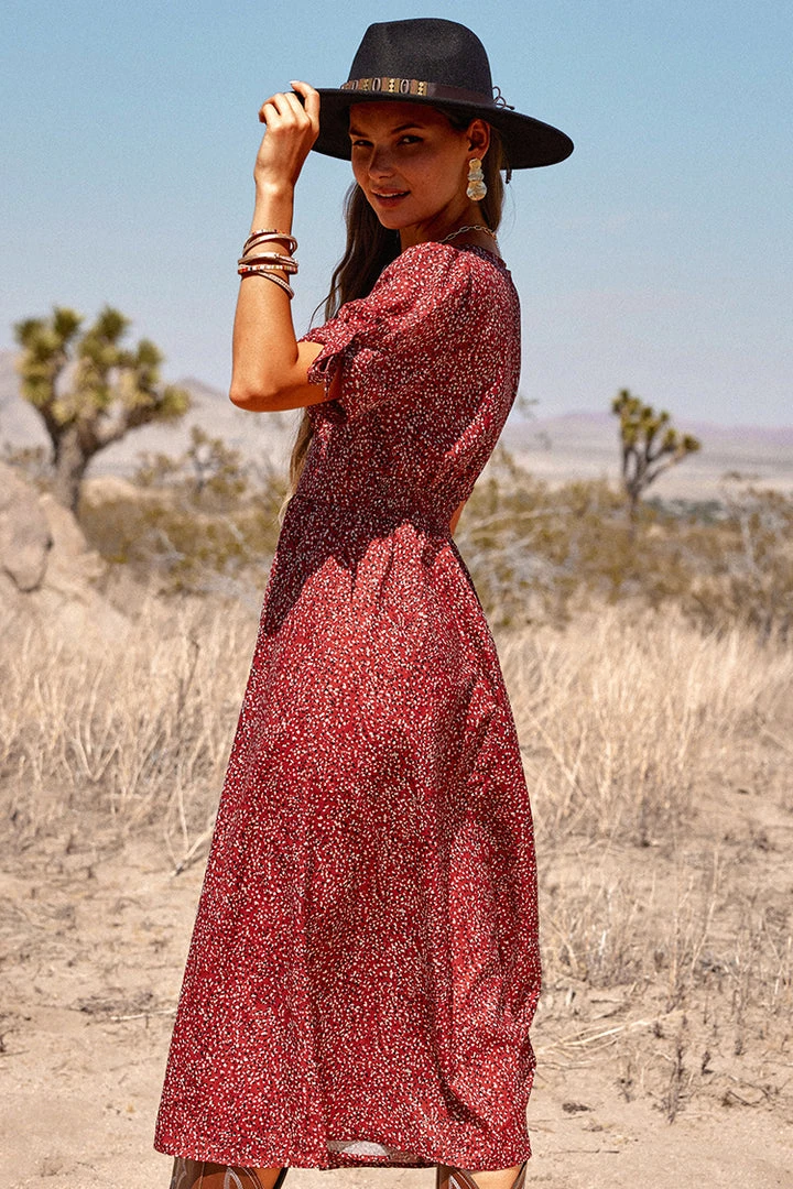 A-shape Dress. Featuring a V neckline, bubble sleeves, and buttons at front design.