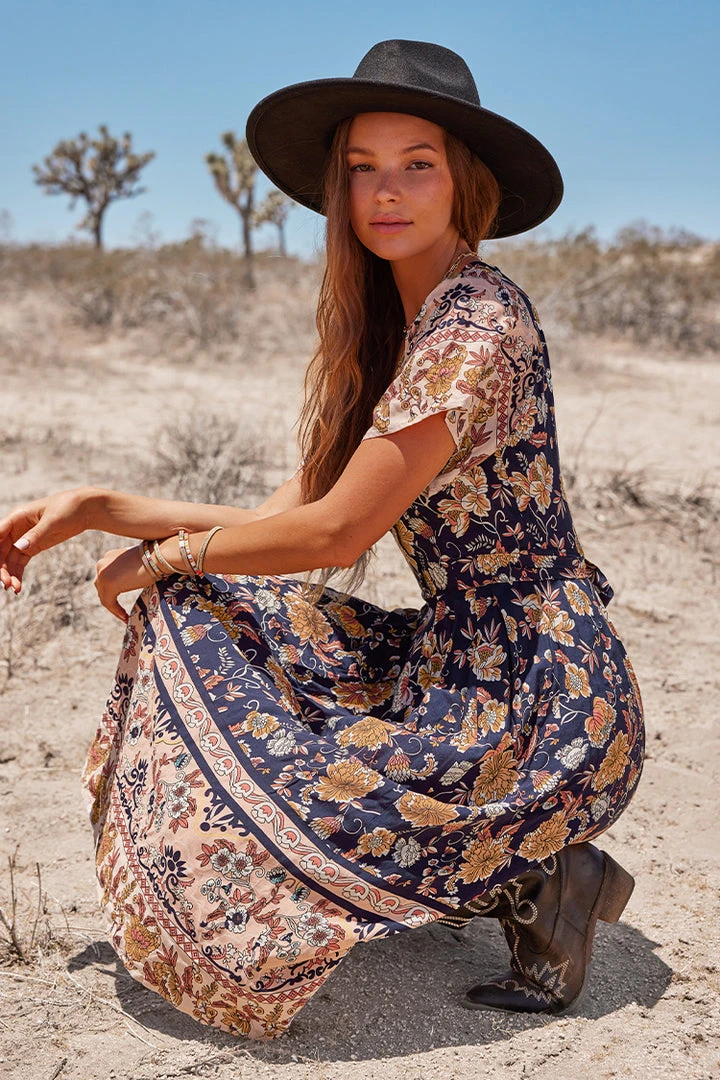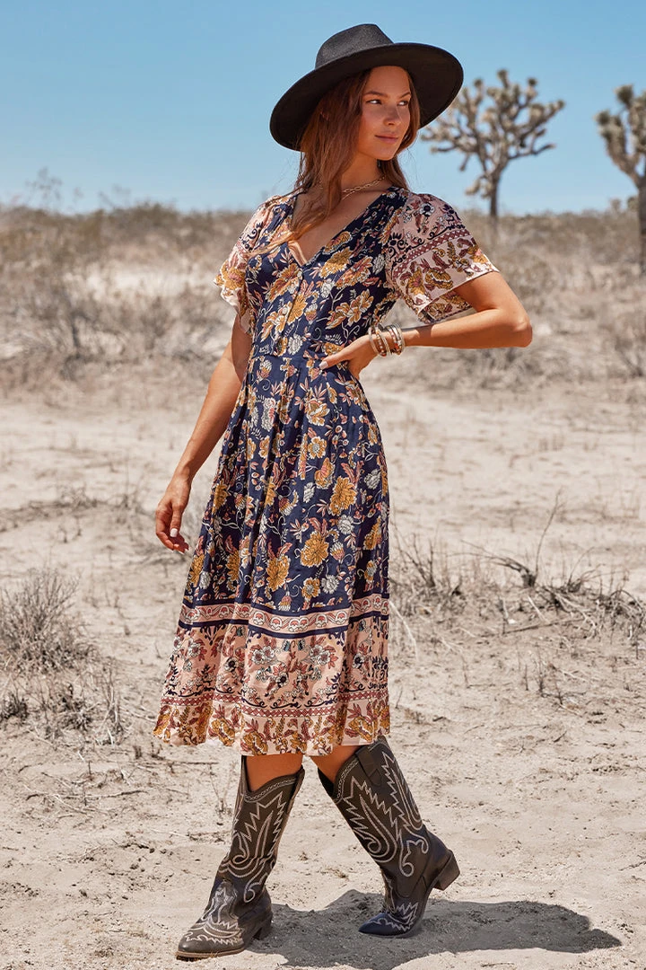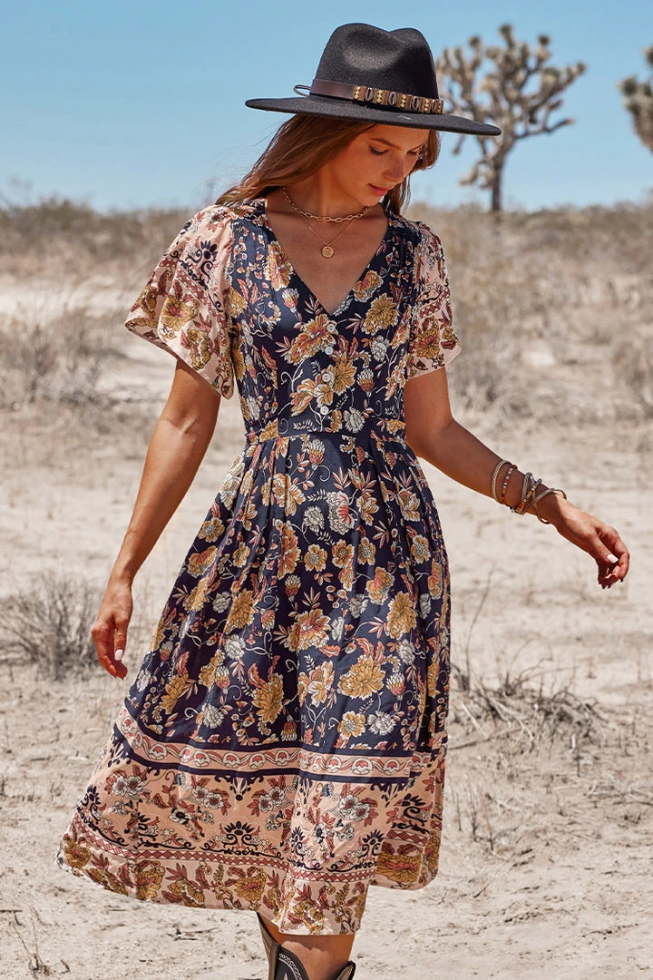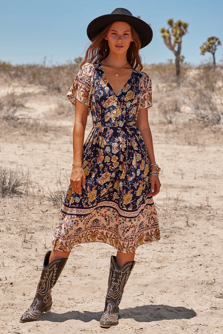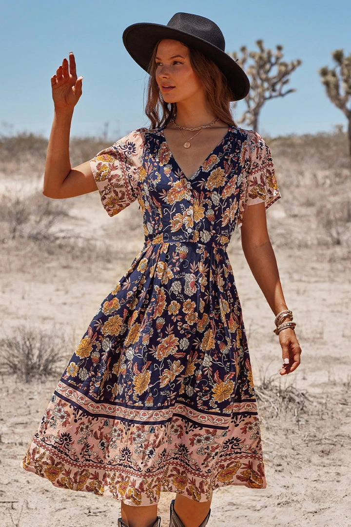 Take a chance on boho style with this Dolman Sleeve V-neck A-shape Dress. Featuring a V neck dolman sleeves, blooming flower patterns all-over.