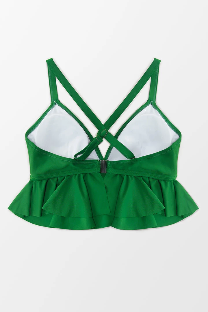 Feel cute and comfy in our Zoe Ruffle Crisscross Plus Size Bikini Top. This bikini top has long ruffles under the bust for extra coverage. Mix and match with our Zoe Floral High Waisted Plus Size Bikini Bottom.