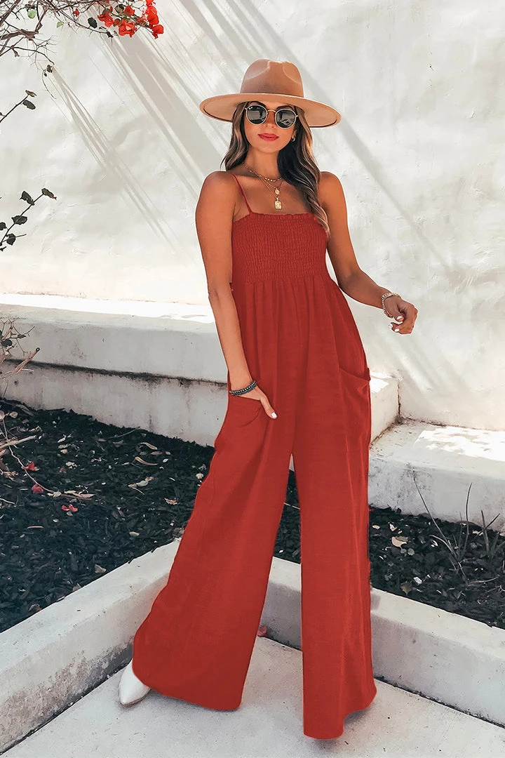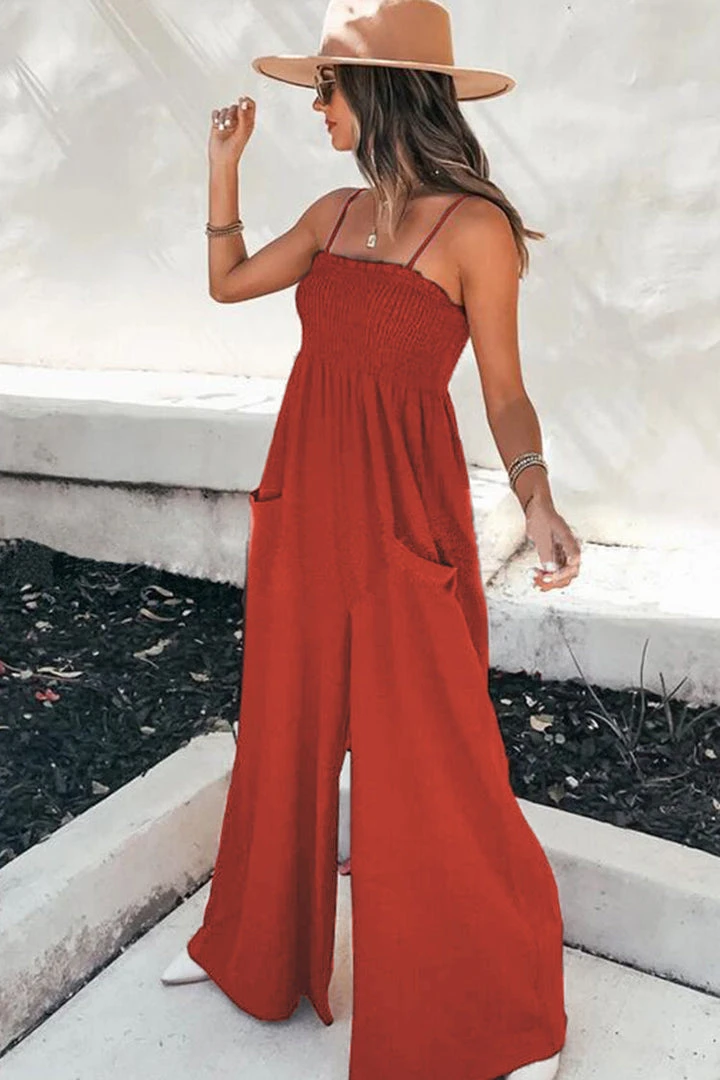 This Sleeveless Square Neck Smocking Jumpsuit will give you a comfortable feeling. Featuring polyester fabric with ruching and smocking detailing. Style with heels and a pendant necklace for a chic vibe.